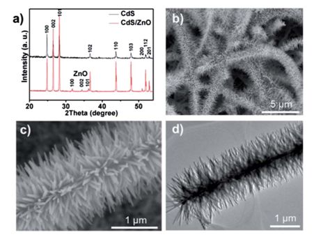 圖1:(a)CdS納米帶與CdS/ZnO樹枝狀異質結的XRD峰對比。(b)低倍數SEM下觀測到的CdS/ZnO樹枝狀異質結。(c)(d)分別對應SEM和TEM下觀測到的CdS/ZnO樹枝狀異質結。