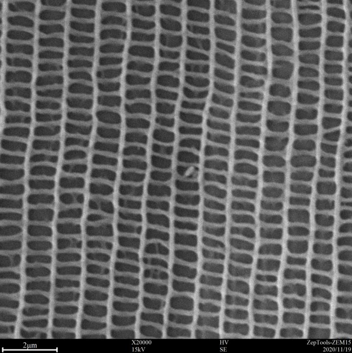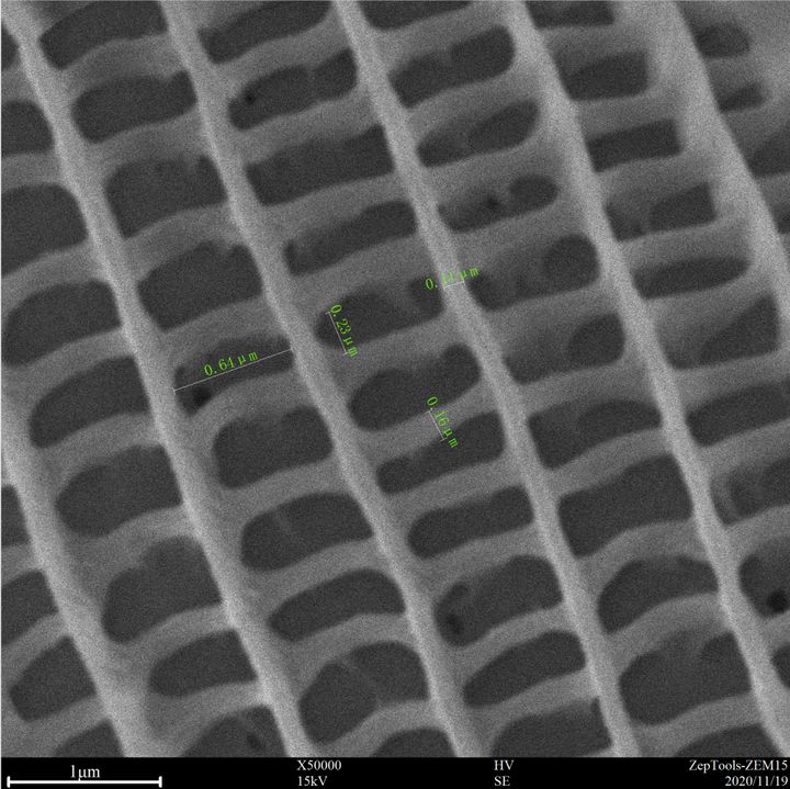 50000倍下,結(jié)構(gòu)色的奧秘盡收眼底,100-150 nm左右的細絲組成了300*650 nm左右的方格,這些方格進而組成周期結(jié)構(gòu),就是這些密排結(jié)構(gòu)接受外來光線以后能發(fā)生不同的折射、干涉,然后反射出部分特殊光頻率的光線而產(chǎn)生不同的色彩。